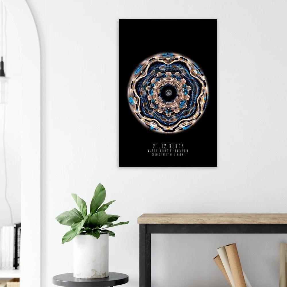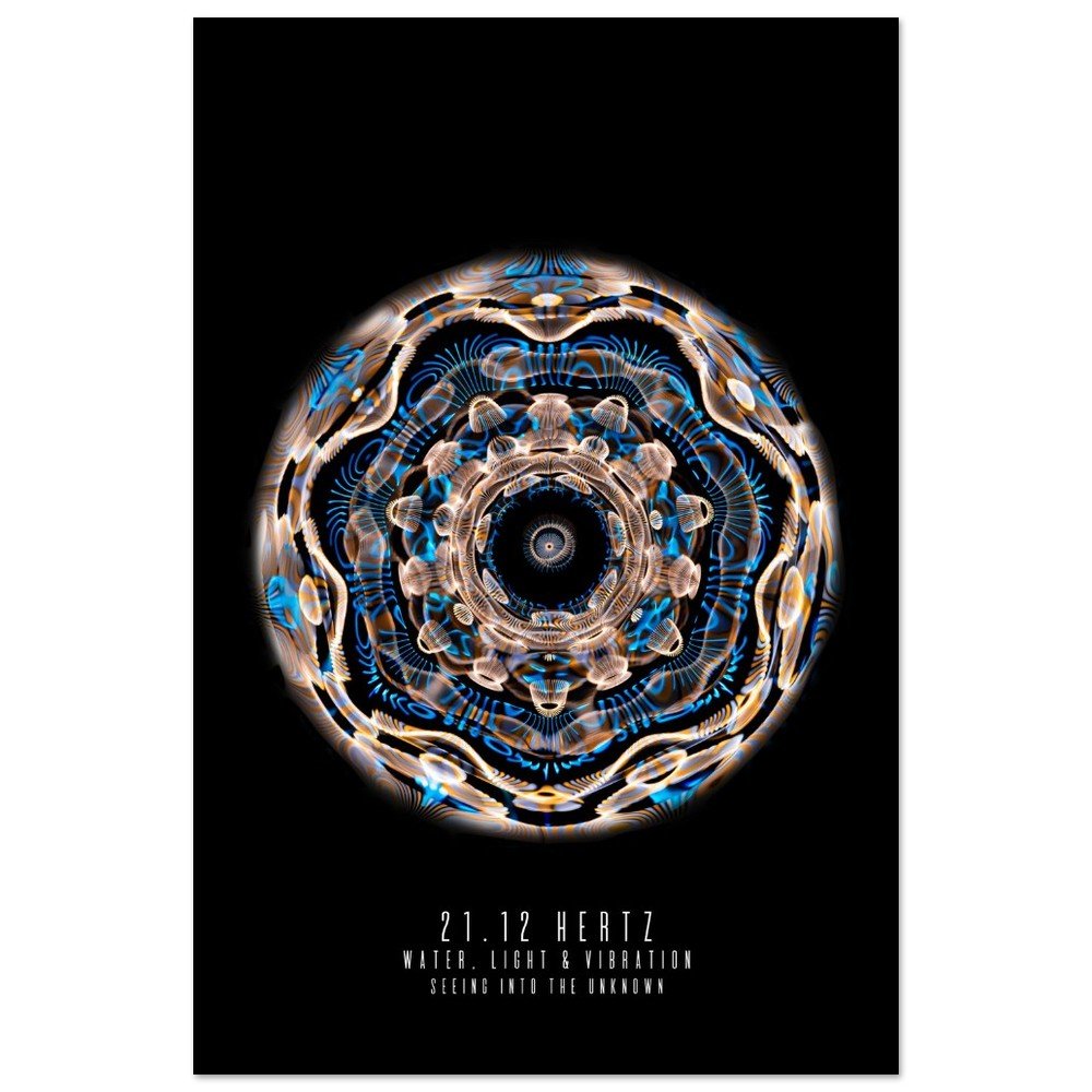 Cymatics: The study of visible sound. This photograph was captured using a dish of water, vibrating to 21.12 hertz, with lights shining down from above. High-quality, lighter-weight, classic semi-glossy paper. 24" x 36".