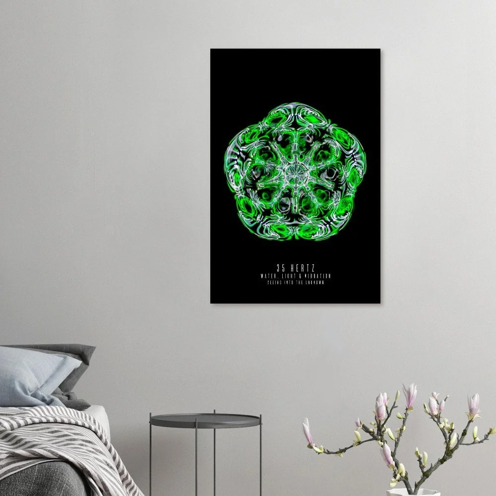 This photo/print was captured using a dish of water, vibrating to a specific frequency, with lights shining down on it. Cymatics: Visualizing sound & frequency. High-quality, lighter-weight, classic semi-glossy paper. 24" x 36".